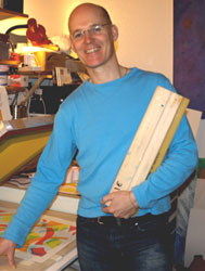 I construct my prints using paper and photo stencils, building up opaque and transparent bands of colour, sometimes scraping and washing the surface to reveal concealed layers. I enjoy the crispness of edge and line, smooth flowing lyrical curves and the intensity of primary and complementary colours. These images are captured moments of larger worlds that extend beyond the boundaries of the picture plane